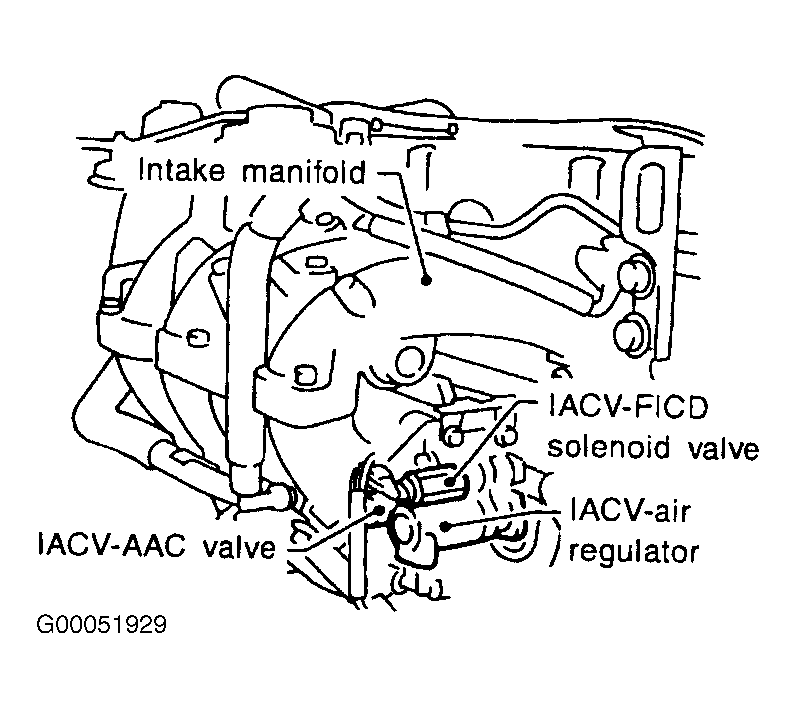 - Check IACV-FICD solenoid valve. See IDLE AIR CONTROL VALVE-FAST IDLE CONTROL DEVICE SOLENOID VALVE . Replace IACV-FICD solenoid valve, if necessary. If IACV-FICD solenoid valve is okay, go to next step.