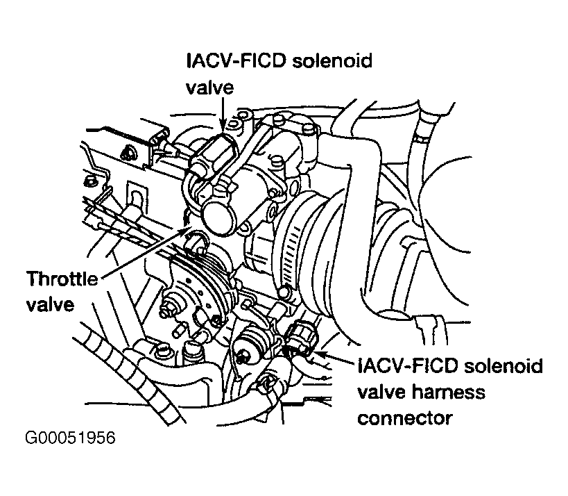 5. Check IACV-FICD solenoid valve. See IDLE AIR CONTROL VALVE-FAST IDLE CONTROL DEVICE SOLENOID VALVE . Replace IACV-FICD solenoid valve, if necessary. If IACV-FICD solenoid valve is okay, go to next step.