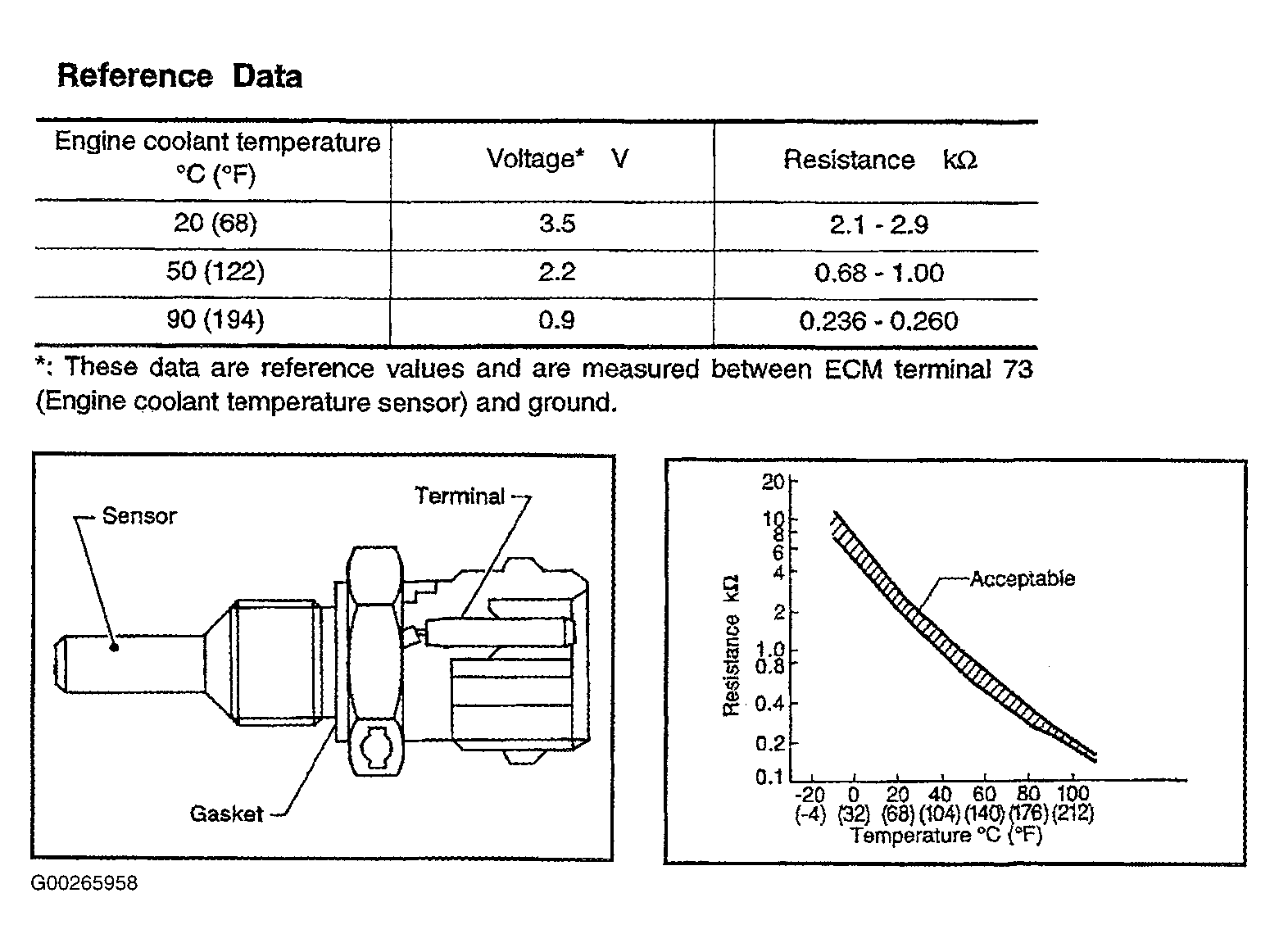The engine coolant temperature sensor is used to detect the engine coolant temperature. The sensor modified signal returns to the ECM as the engine coolant temperature input. The sensor uses a thermistor which is sensitive to the change in temperature. The electrical resistance of the thermistor decreases as temperature increases. See Fig 1.