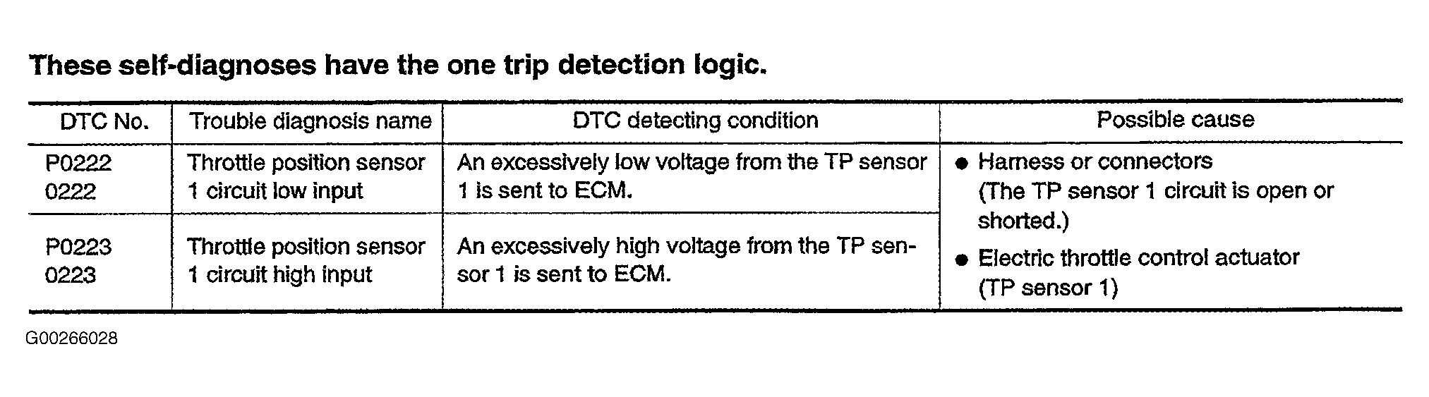 DTC P0222: Throttle Position Sensor 1 Circuit Low Input & DTC P0223: Throttle Position Sensor 1 Circuit High Input