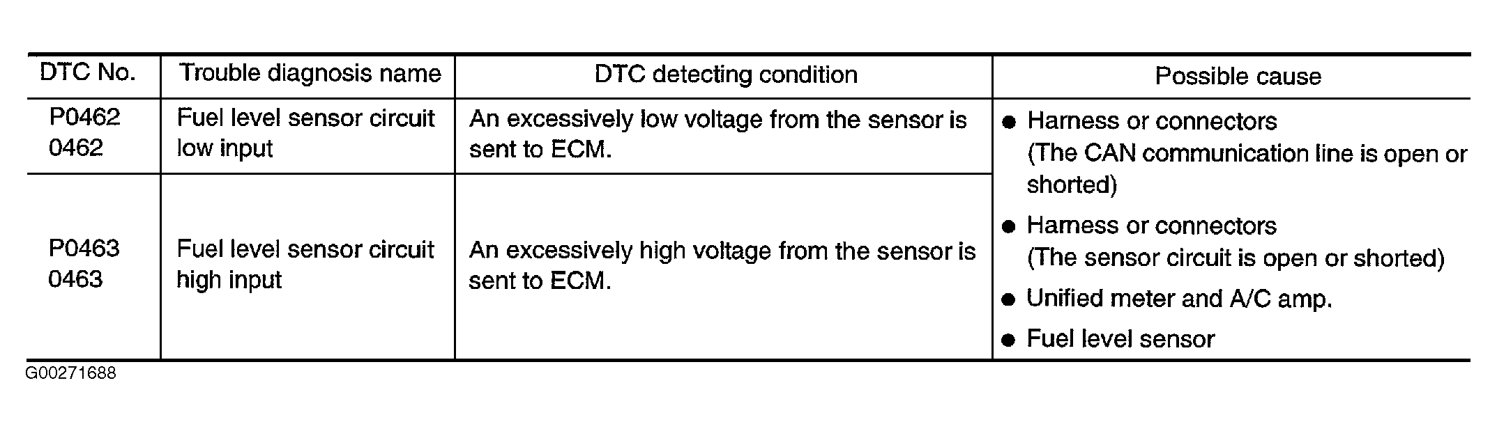 For DTC P0462 and P0463 on-board diagnosis logic, see Fig 1. This diagnosis indicates the former, to detect open or short circuit malfunction.