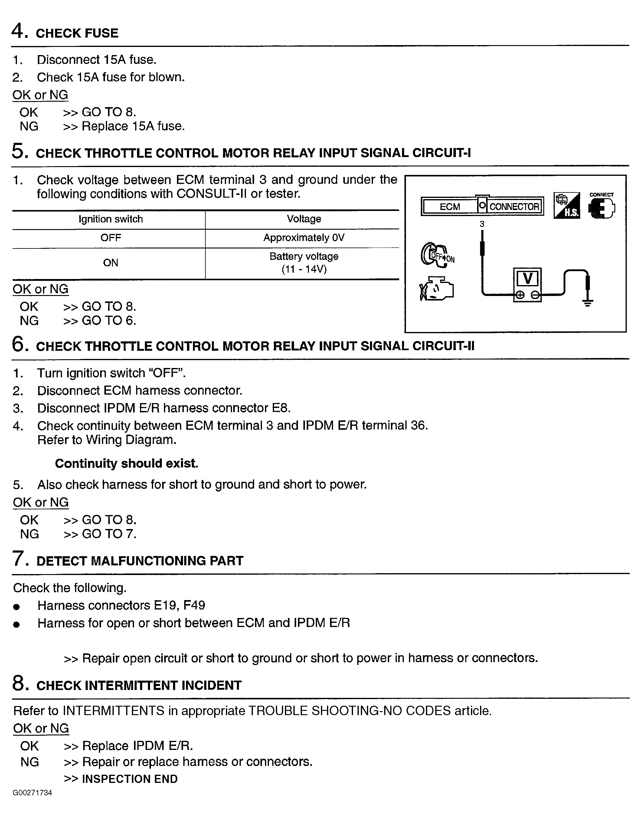 Home >> Infiniti >> 2003 >> FX35 AWD >> Repair and Diagnosis >> Engine Performance >> System >> Engine Controls - Self-Diagnostics >> Diagnostic Tests >> DTC P1124: Throttle Control Motor Relay Circuit Short & DTC P1126: Throttle Control Motor Relay Circuit Open >> Diagnostic Procedure