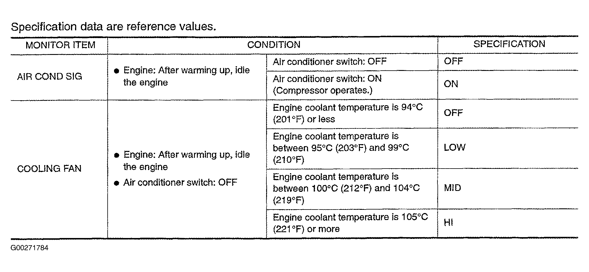 For engine cooling fan circuit specification data, see
