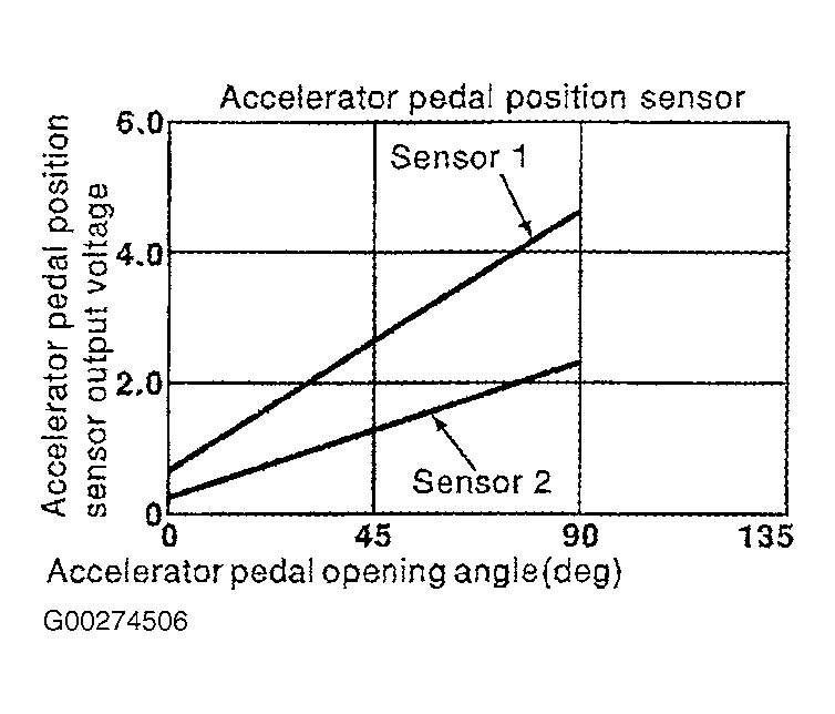 The Accelerator Pedal Position (APP) sensor is installed on the upper end of the accelerator pedal assembly. The sensor detects the accelerator position and sends a signal to the ECM. Accelerator pedal position sensor has 2 sensors. These sensors are a kind of potentiometers which transform the accelerator pedal position into output voltage, and emit the voltage signal to the ECM. See Figure. In addition, these sensors detect the opening and closing speed of the accelerator pedal and feed the voltage signals to the ECM. The ECM judges the current opening angle of the accelerator pedal from these signals and controls the throttle control motor based on these signals. Idle position of the accelerator pedal is determined by the ECM receiving the signal from the accelerator pedal position sensor. The ECM uses this signal for the engine operation such as fuel cut.
