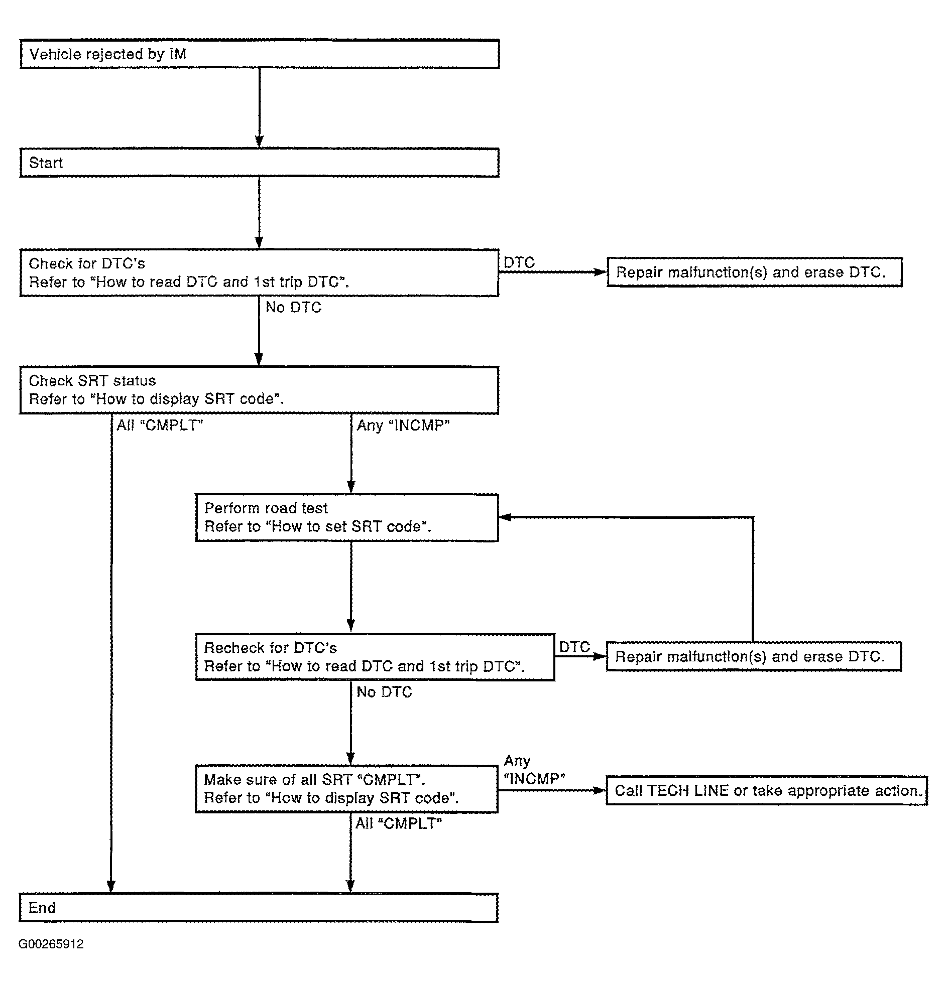 SRT can be set as CMPLT together with the DTC(s). Therefore, DTC check must always be carried out prior to the state emission inspection even though the SRT indicates CMPLT. If a vehicle has failed the state emissions inspection due to one or more SRT items indicating INCMP, review the flowchart diagnostic sequence. See Fig 2.