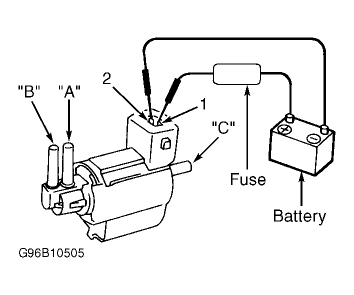 - With GST - Check air passage continuity and operation delay time under the following conditions. If 12 volts is applied between terminals No. 1 and 2, air passage continuity between "A" and "B" should exist, and air passage continuity between "A" and "C" should not exist. See Figure. If no voltage is applied, there will be no air passage continuity between "A" and "B", but there will be air passage continuity between "A" and "C".
