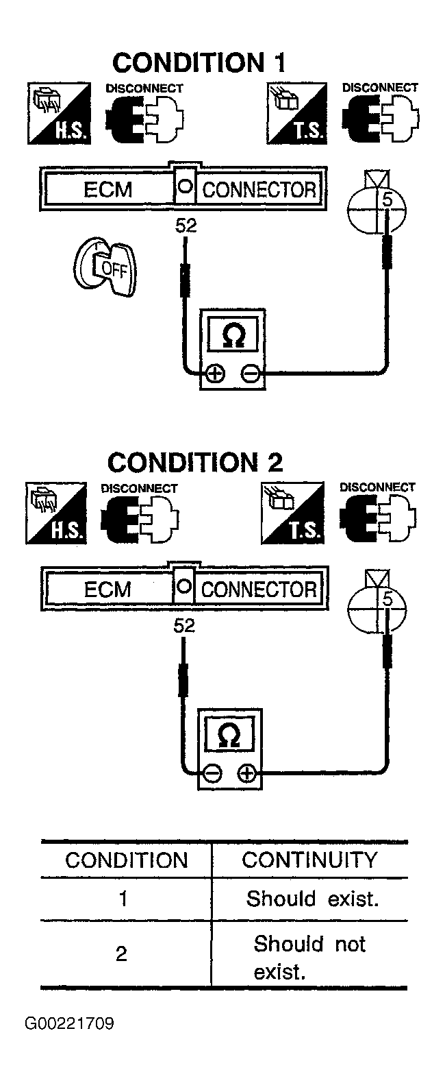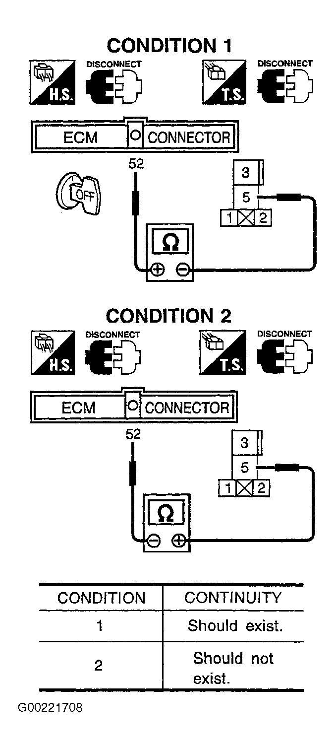 8. Stop engine. Ensure ignition switch is in OFF position. Disconnect ECM harness connector. Disconnect headlight relay harness connector. See ENGINE PERFORMANCE in SYSTEM WIRING DIAGRAMS article in ELECTRICAL. Using ohmmeter, check continuity between ECM harness connector terminal No. 52 and LH headlight relay harness connector terminal No. 5. Ensure ohmmeter leads are correctly placed for both test conditions. See Fig 2. Also check harness for short to ground or short to power. If no problem is found, go to next step. If problem is found, go to step  10.