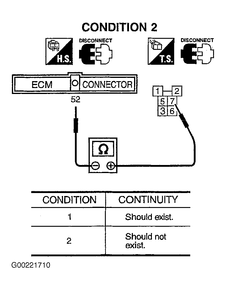 4. Turn ignition switch to OFF position. Disconnect ECM harness connector. Disconnect rear window defogger relay. See ENGINE PERFORMANCE in SYSTEM WIRING DIAGRAMS article in ELECTRICAL. Using ohmmeter, check continuity between ECM harness connector terminal No. 52 and rear window defogger relay harness connector terminal No. 7. Ensure ohmmeter leads are correctly placed for both test conditions. See Fig 1. Also check harness for short to ground or short to power. If no problem is found, go step  6. If problem is found, go to next step.