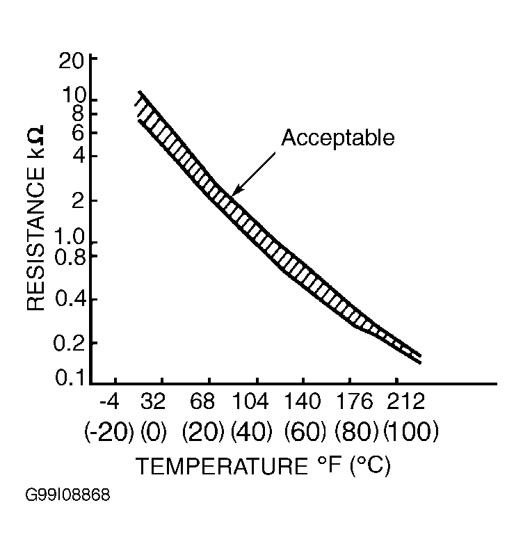 - Measure resistance between IAT sensor terminals No. 3 and 5. Resistance should be within acceptable range shown in illustration. See Fig 1