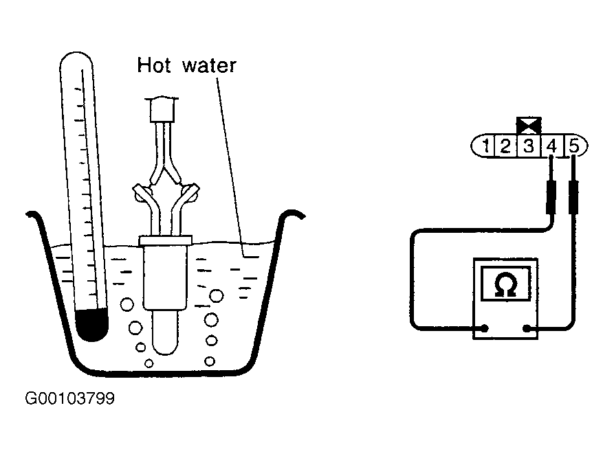 - Remove fuel pump assembly. Measure resistance between fuel pump assembly connector terminals No. 4 and 5, with FTT sensor submerged in heated water. See Figure . Resistance should be within acceptable range shown in illustration. See Figure . If resistance is as specified, go to next step. If resistance is not as specified, replace FTT sensor.