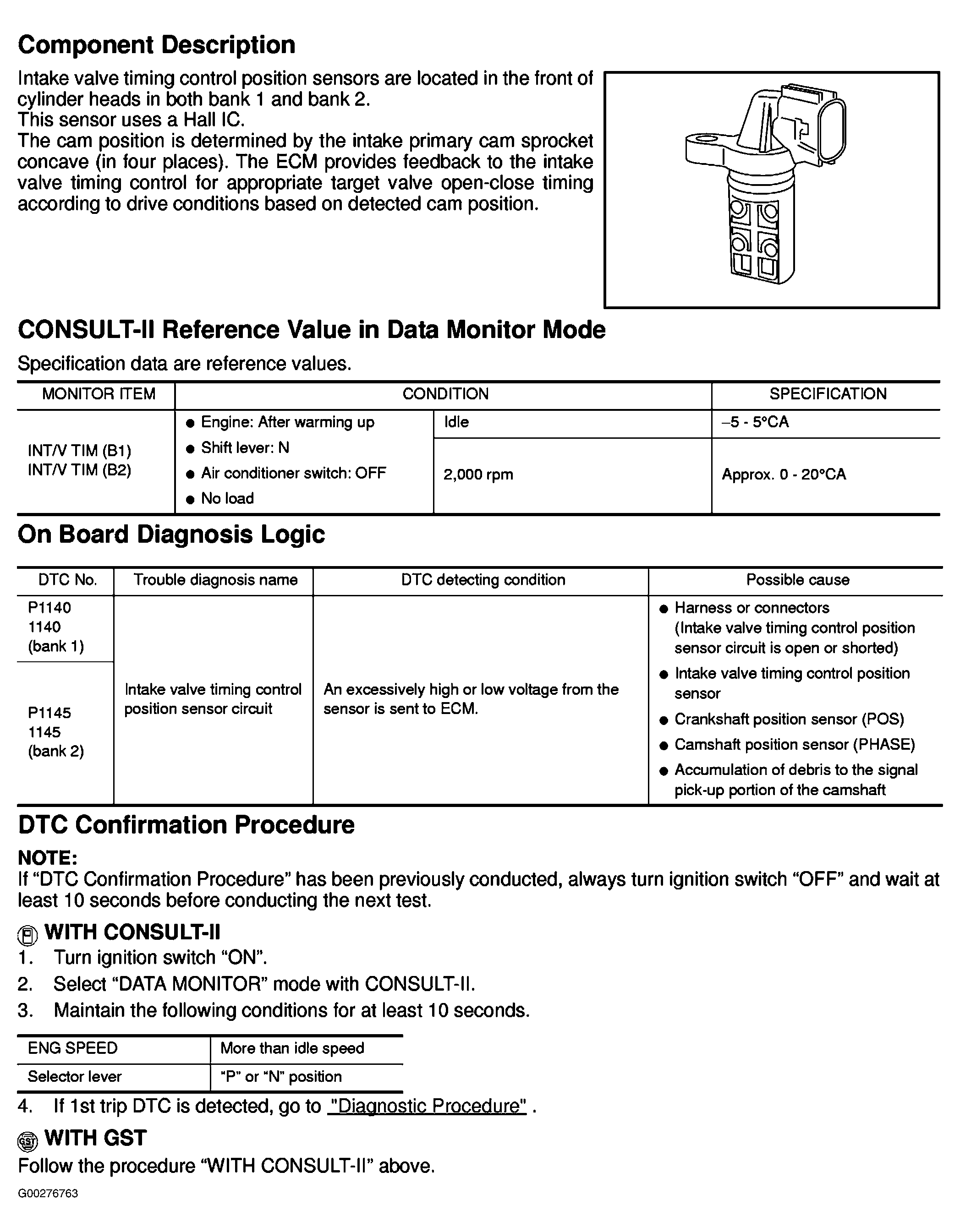 Home >> Infiniti >> 2003 >> M45 >> Repair and Diagnosis >> Engine Performance >> System >> Engine Controls - Self-Diagnostics >> Diagnostic Tests >> DTC P1140 Or DTC P1145: Bank 1 Or Bank 2 Intake Valve Timing Control (IVTC) Position Sensor (Circuit) >> Component Description, CONSULT-II Reference Value In Data Monitor Mode, On Board Diagnosis Logic & DTC Confirmation Procedure