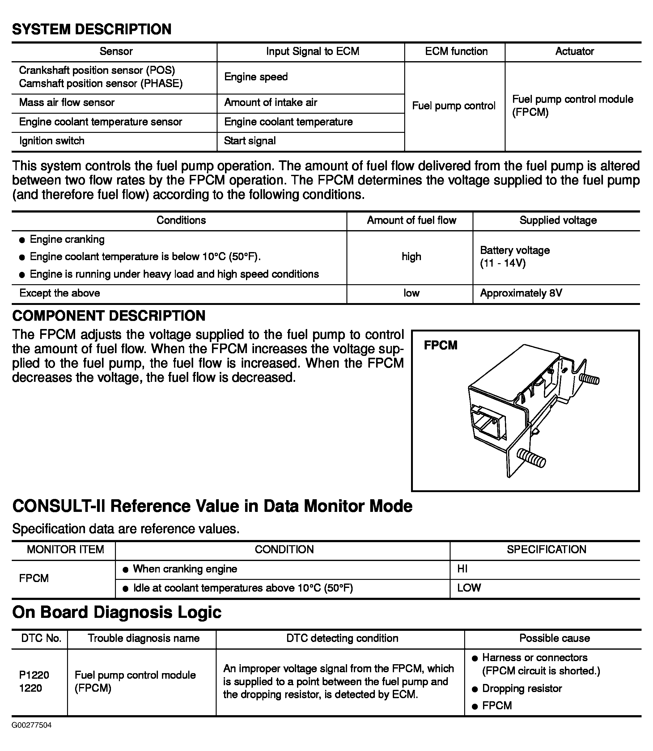 Home >> Infiniti >> 2003 >> M45 >> Repair and Diagnosis >> Engine Performance >> System >> Engine Controls - Self-Diagnostics >> Diagnostic Tests >> DTC P1220: Fuel Pump Control Module >> System Description, Component Description, CONSULT-II Reference Value In Data Monitor Mode & On Board Diagnosis Logic