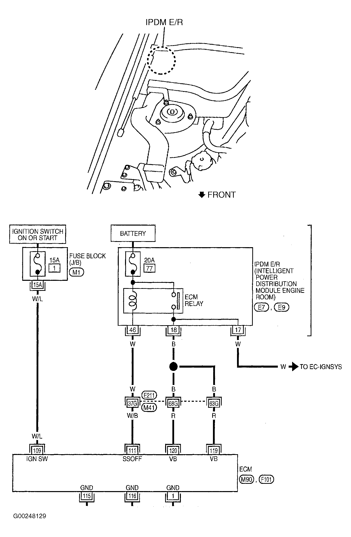 6. Reconnect ECM harness connector. Turn ignition switch to ON position. Check voltage between ground and IPDM E/R connector E7 terminal No. 17. See Figure. Battery voltage should exist. If voltage is as specified, see appropriate IGNITION COIL & POWER TRANSISTOR test in IGNITION SIGNAL under IGNITION SYSTEM. If voltage is not as specified, go to next step.
