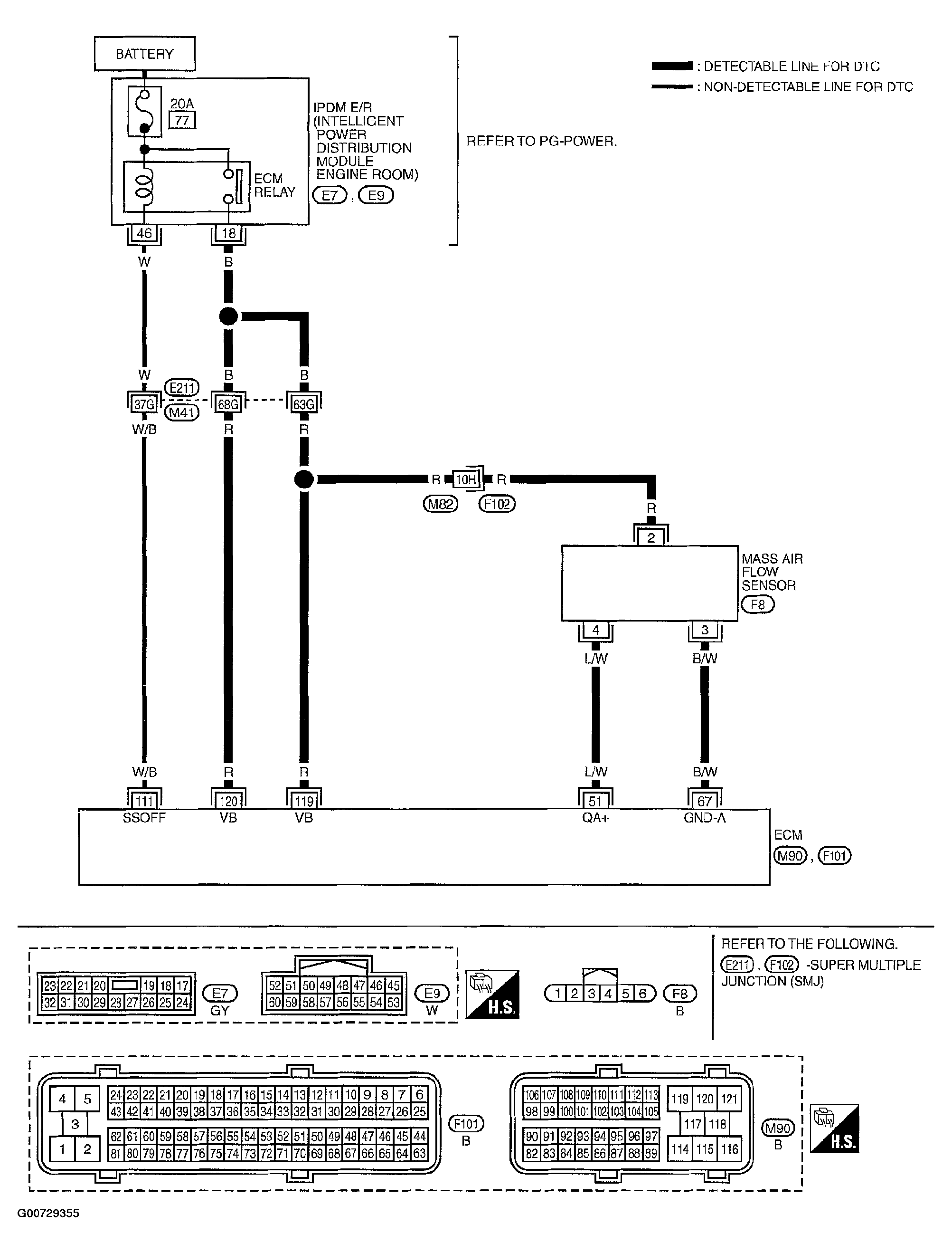 - Harness for open or short between IPDM E/R and mass air flow sensor