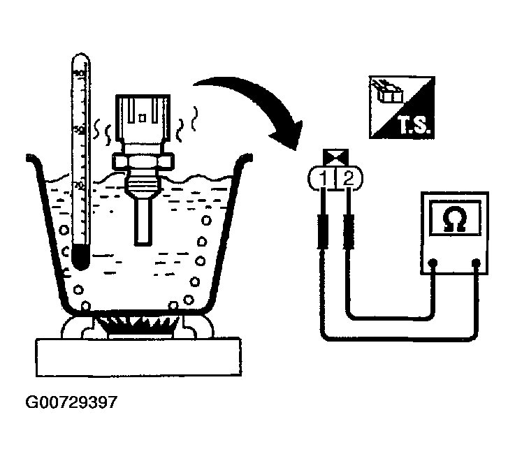 1. Check resistance between engine coolant temperature sensor terminals 1 and 2 as shown in the figure. See Figure.
