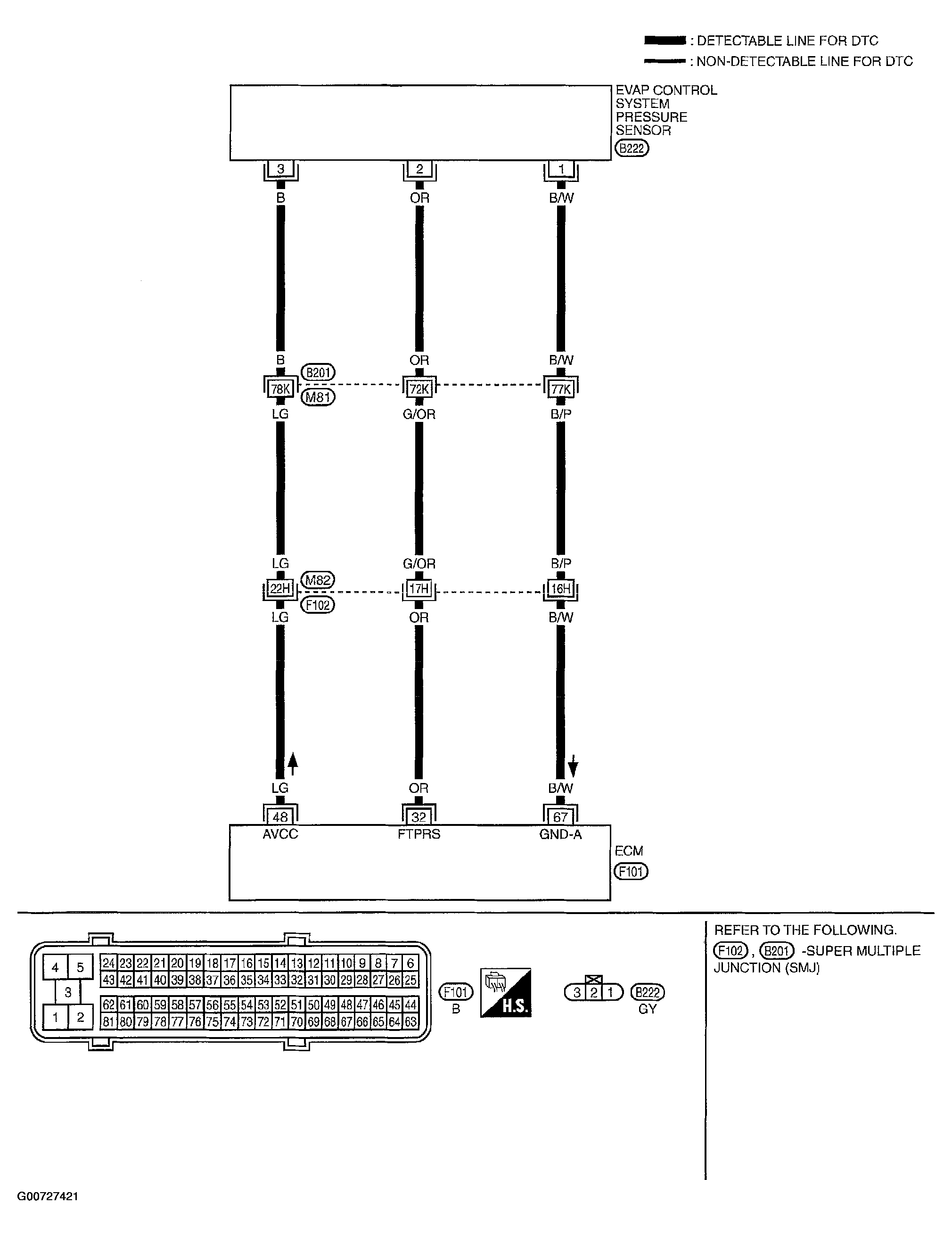 - Check harness continuity between EVAP control system pressure sensor terminal 1 and ECM terminal 67.