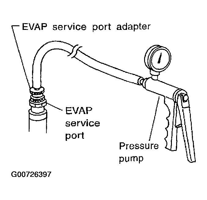 To locate the EVAP leak, install EVAP service port adapter and pressure pump to EVAP service port securely. See Figure and Figure.