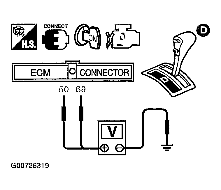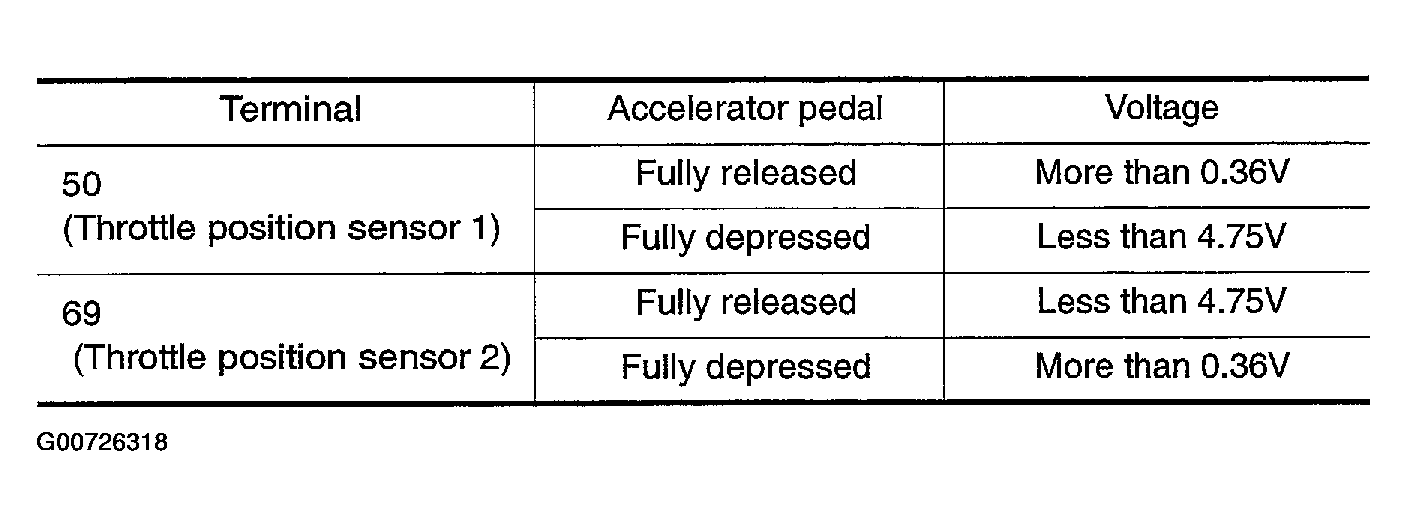 - Check voltage between ECM terminals 50 (TP sensor 1 signal), 69 (TP sensor 2 signal), see Figure, and engine ground under the following conditions. See Figure.