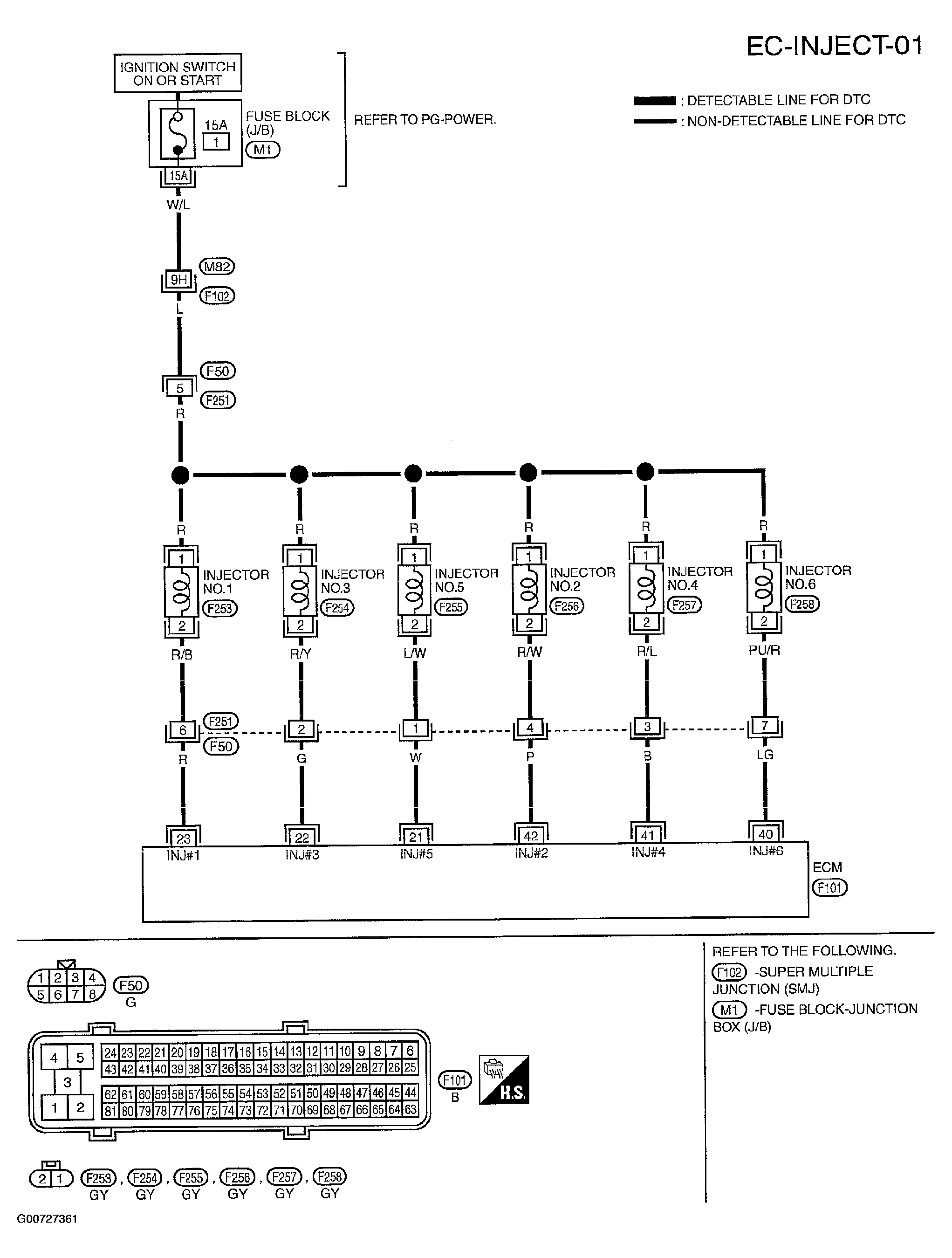 - Check harness continuity between injector terminal 2 and ECM terminals 21, 22, 23, 40, 41, 42.