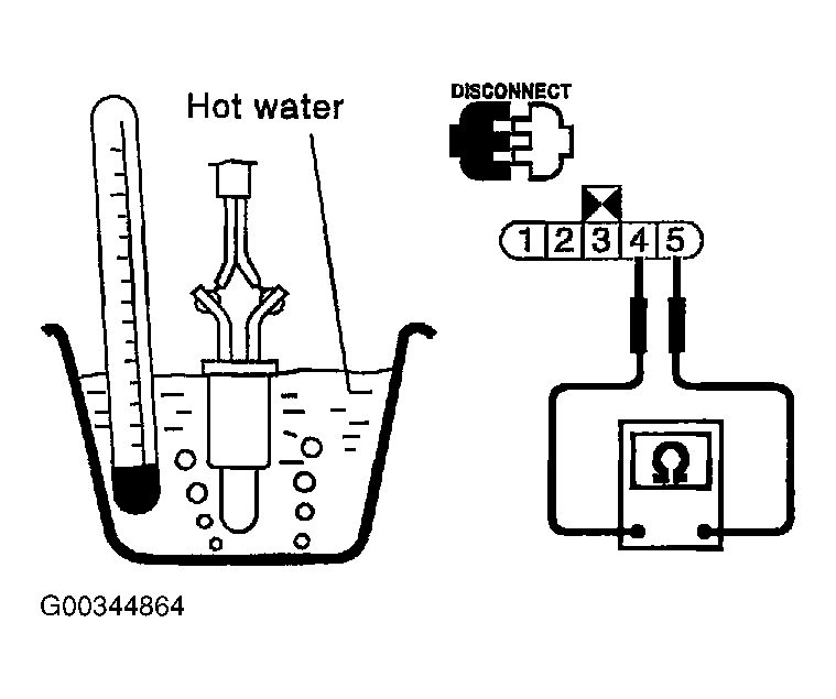 Check resistance between fuel level sensor unit and fuel pump terminals 4 and 5 by heating with hot water or heat gun as shown in