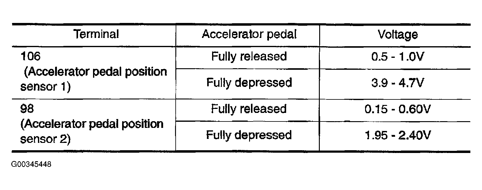 - Check voltage between ECM terminals 106 (APP sensor 1 signal), 98 (APP sensor 2 signal) and ground, see Figure , under the following conditions. See Figure .