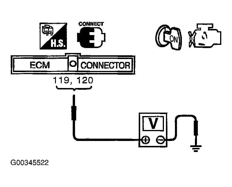 - Check voltage between ECM terminals 119, 120 and ground with CONSULT-II or tester. See Figure