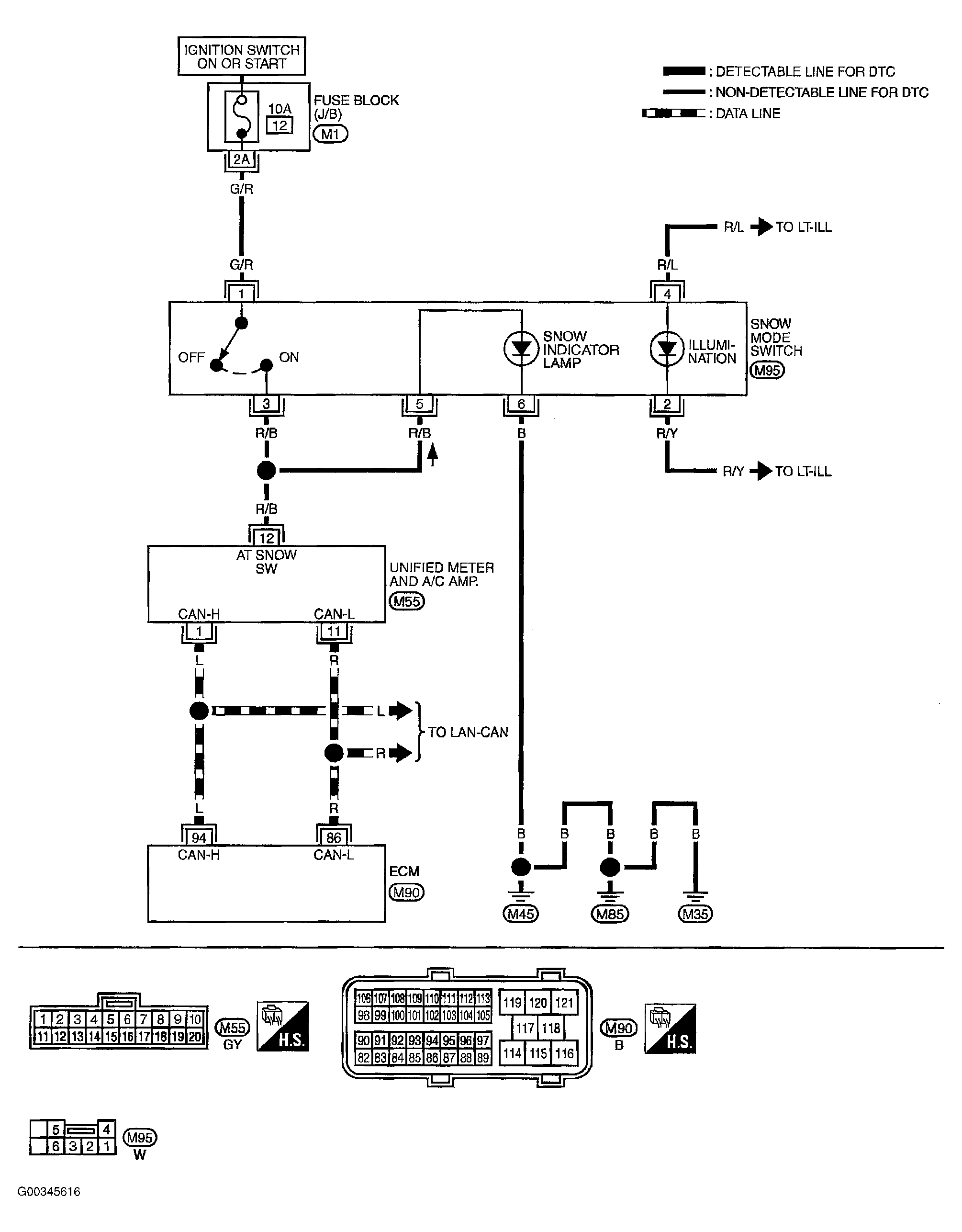 - Check harness continuity between snow mode switch terminal 3 and unified meter and A/C amp. terminal 12. Refer to wiring diagram. See Figure