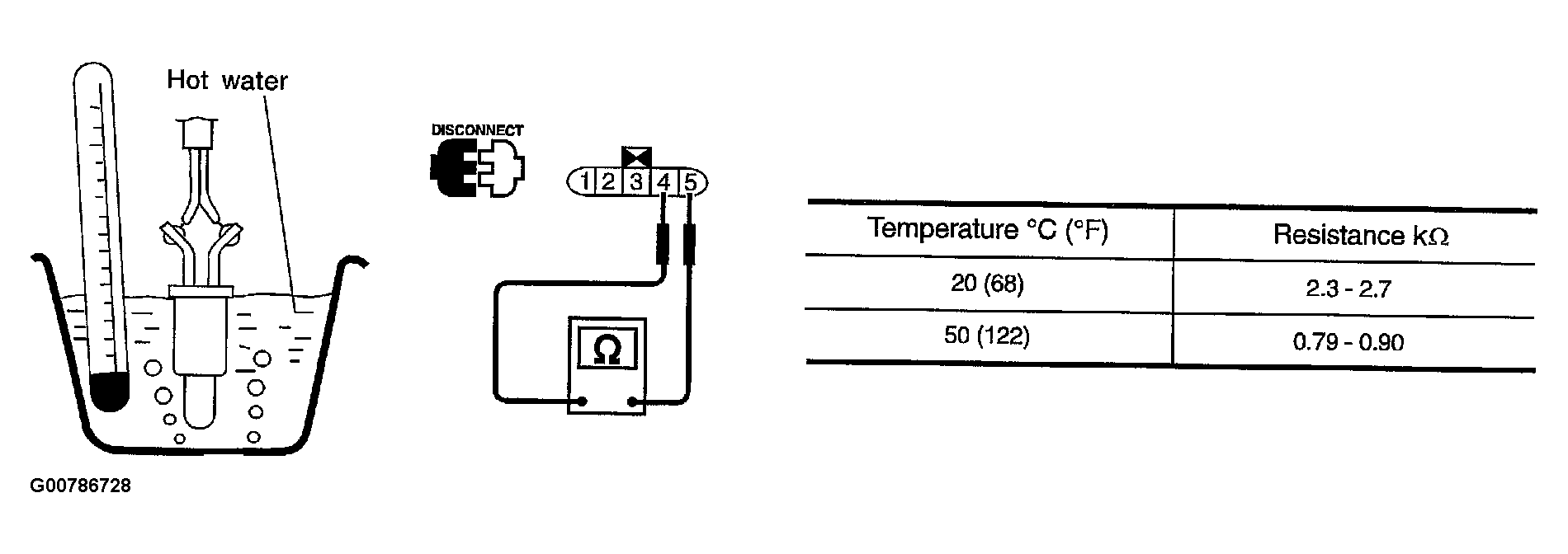 - Check resistance between fuel level sensor unit and fuel pump terminals 4 and 5 by heating with hot water or heat gun as shown in Figure .