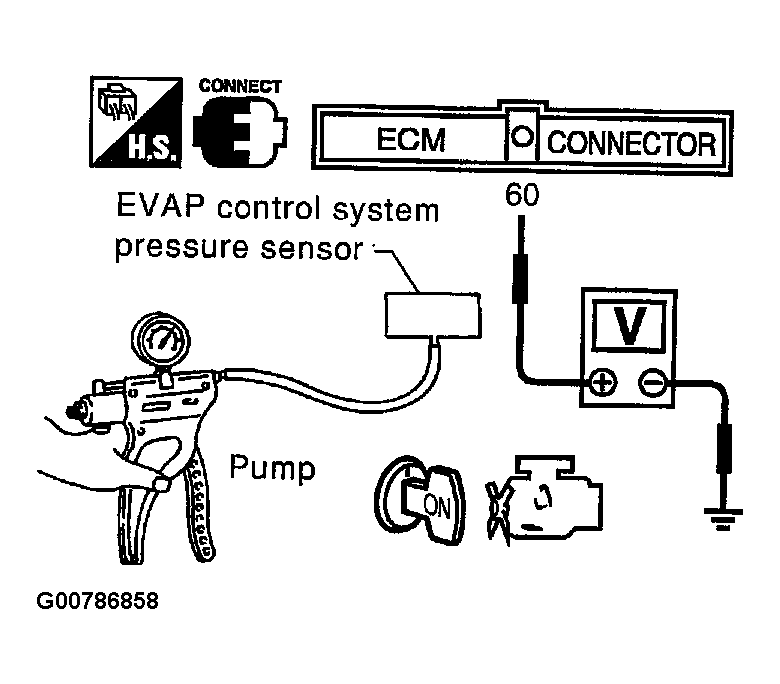 - Use pump to apply vacuum and pressure to EVAP control system pressure sensor as shown in Figure