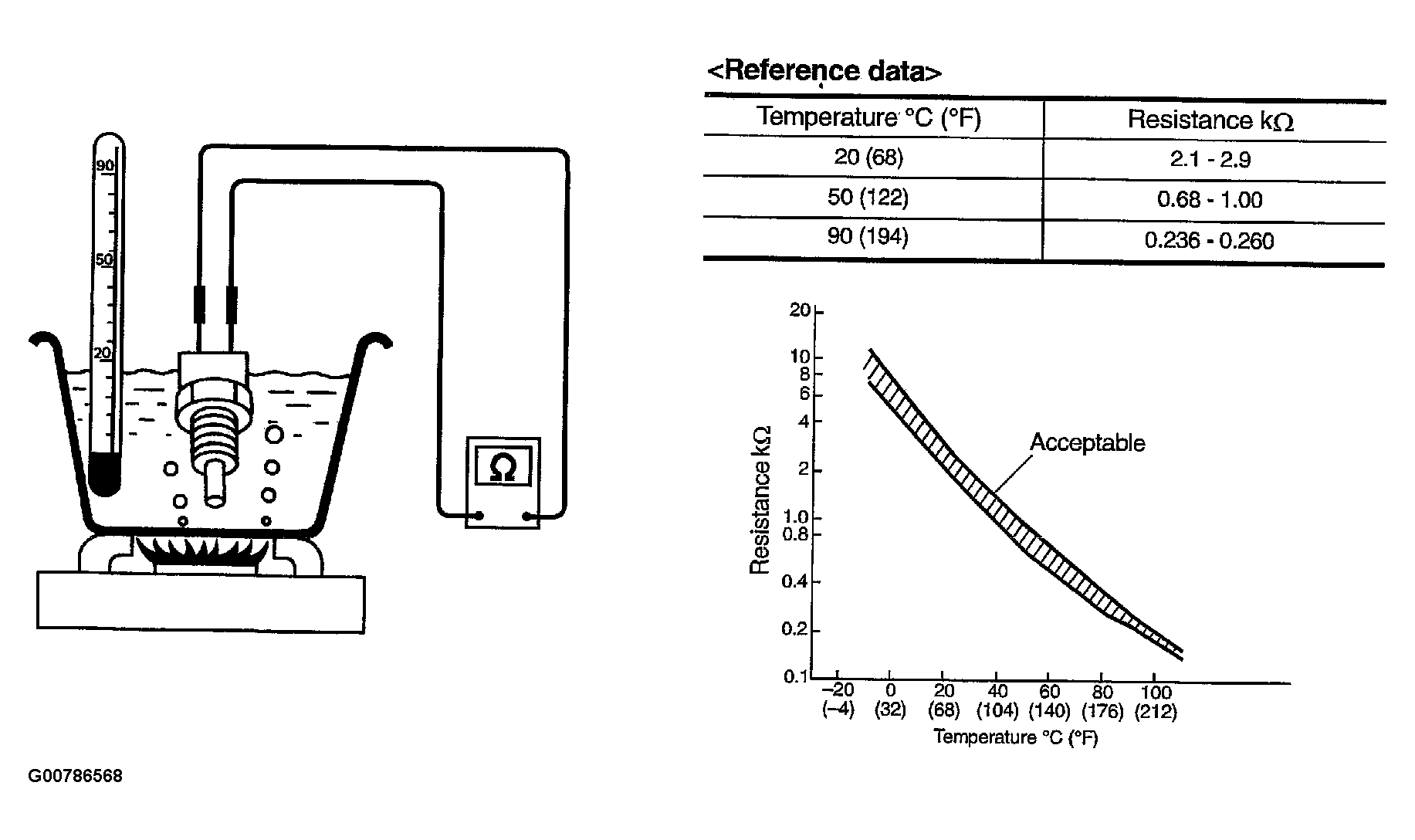 - Check resistance between engine coolant temperature sensor terminals 1 and 2 as shown in Figure .