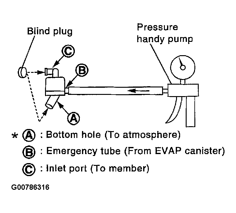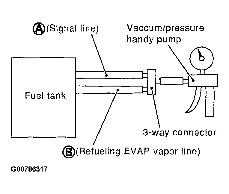 - Apply pressure to both hose ends A and B [20 kPa (150 mmHg, 5.91 inHg)] using a pressure pump and a suitable 3-way connector. Check that there is no leakage. See Figure .