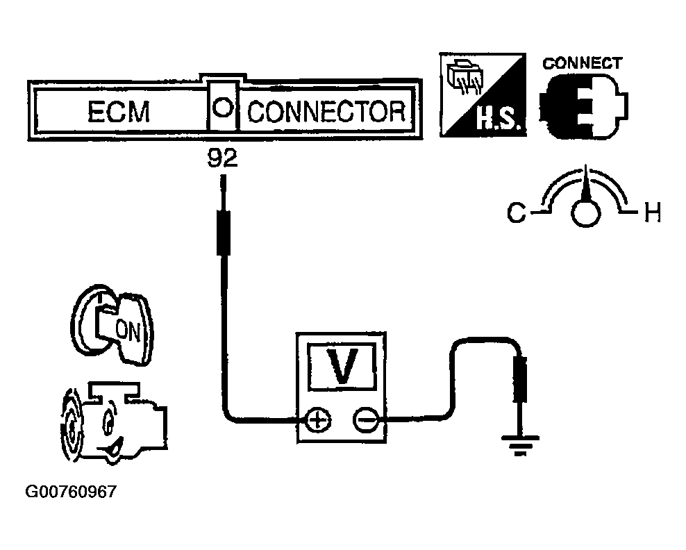 - Check that voltage between ECM terminal 92 (Fuel tank temperature sensor signal) and ground is less than 4.2V. See Figure.