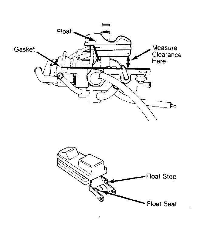 Invert air horn and allow float to hang. Measure clearance between top of float and air horn gasket. See Fig 1 . If clearance is not within specification, bend float seat. For float level specification, see I-MARK CARBURETOR ADJUSTMENT SPECIFICATIONS table in this article.