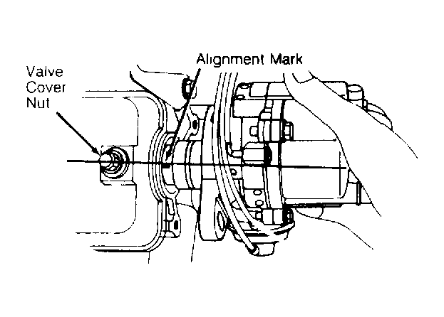 Align timing marks on TDC of compression stroke. Remove high-tension wires and distributor connector. Remove mounting bolt and distributor. Note direction rotor points for reference. To install, reverse removal procedure. Set timing. To align distributor reference marks on I-Mark, See Fig 1 .