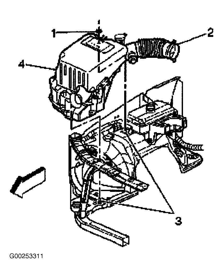 - Install air cleaner cover/resonator assembly (1). Tighten 3 air cleaner cover/resonator retaining screws (2). See Figure .