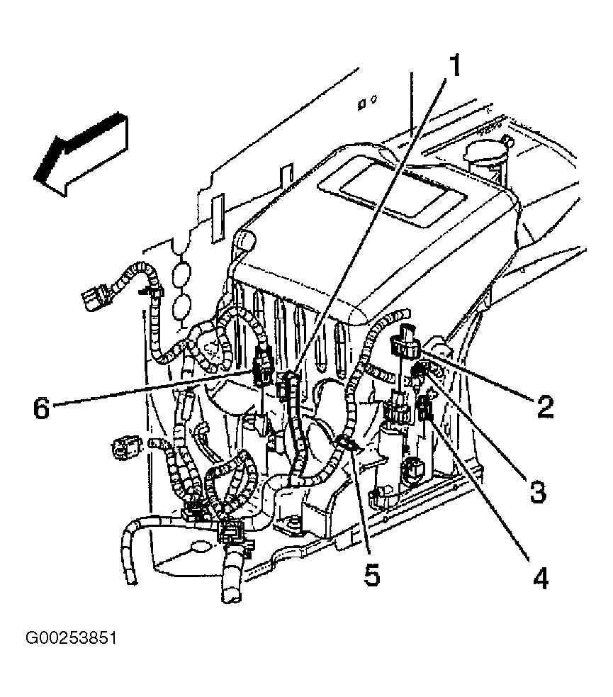 - Install the washer solvent level sensor wire harness to the wire harness retaining clips (3, 5).