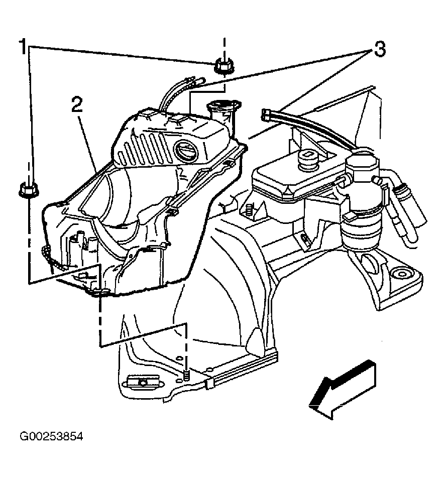 - Install lower air filter housing/washer solvent tank assembly onto the mounting studs. See Figure .