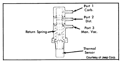 This valve supplies manifold vacuum to vacuum advance at both cold and hot coolant temperatures. At normal coolant temperatures, carburetor ported vacuum is supplied. When coolant temperature is below 149°F, manifold vacuum enters through port "3" and is applied through port "2". This allows full manifold vacuum to distributor.