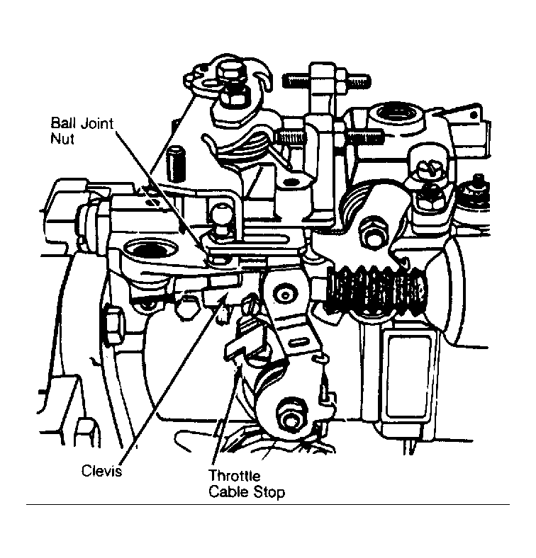 - If necessary, adjust clearance by turning stop lever screw. Insert a .256" (6.50 mm) shim between control lever and lever stop. Insert a .119" (3.00 mm) shim between throttle lever and idle stop screw. Loosen ball joint nut. See Fig 2.