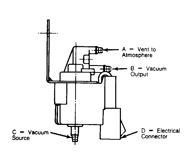 2. Start and idle the engine. There should be no vacuum at "B". Disconnect electrical connector "D" from the solenoid. There should now be vacuum at "B".