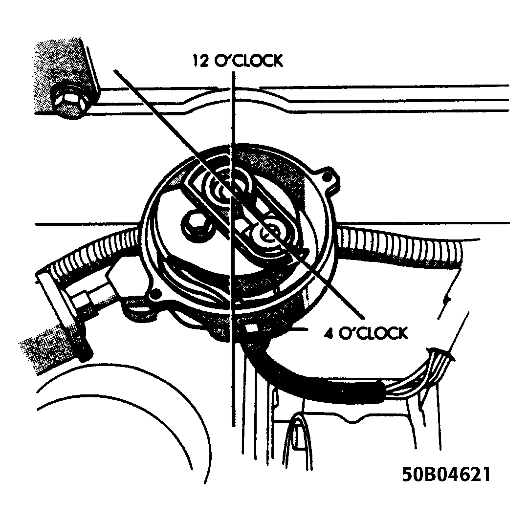 - The rotor should be in the 5 o'clock position with the trailing edge of the rotor blade lined up with the mark previously scribed on the distributor housing (number one spark plug wire post location).