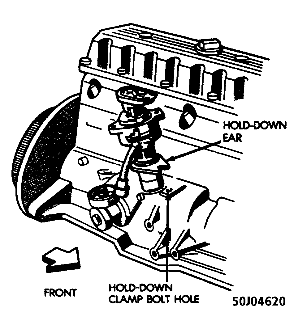 - Visually line up the hold down ear of the distributor housing with the hold down clamp hole. See Fig 2