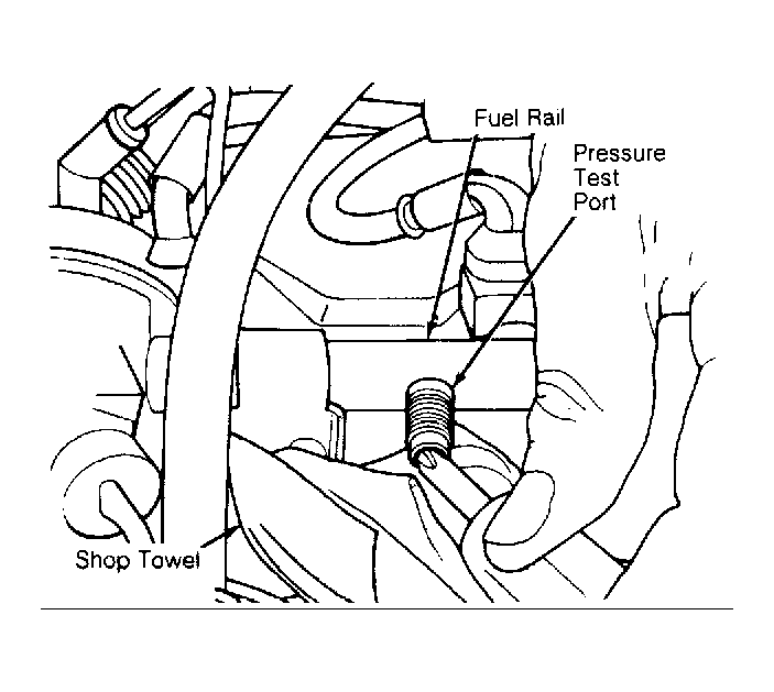Disconnect negative battery cable. Remove fuel filler cap. Remove cap from pressure test port on fuel rail. Position shop towels to soak up any spilled fuel. Using a small screwdriver or pin punch, push test port valve in to relieve fuel pressure. See Fig 1 . Install cap over test port. Reconnect negative battery cable.