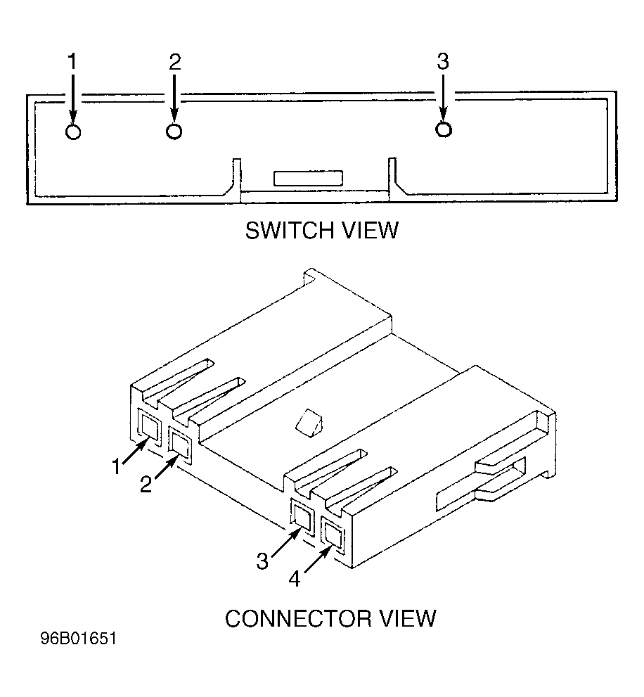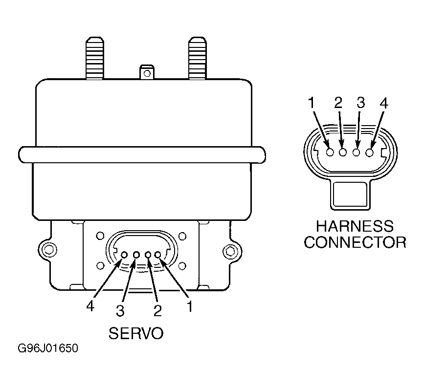 Switch Position Check Between Pin Nos. Ohms Off 1 & 2 798-814 Off 2 & 3 Open On 2 & 3 900-918 Resume/Accel 2 & 3 15,246-15,554 Set/Coast 2 & 3 6584-6716 NOTE: DO NOT depress brake pedal during following step. - With speed control switch on, disconnect speed control servo 4-pin connector. Inspect connector and terminals for damage. Repair connector and terminals as necessary and perform TEST SC-VER . If connector and terminals are okay, go to next step.