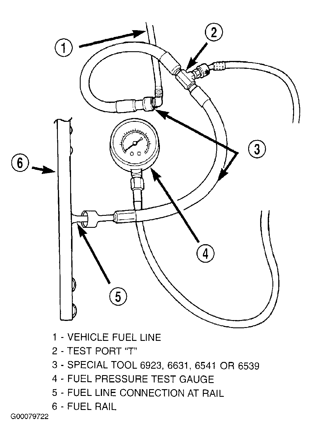 4. Release fuel pressure. Raise and support vehicle. Disconnect fuel pressure line from fuel pump module at fuel tank. Connect Fuel Line Pressure Test Adapter Hose (6539) between disconnected fuel line and fuel pump module. Connect fuel pressure gauge to fuel line adapter hose. Turn ignition on. With DRBIII®, actuate the ASD fuel system test and note fuel pressure. Fuel pressure should be 44.2-54.2 psi (3.23-3.96 kg/cm2 ). If fuel pressure is as specified, stop all actuations. Release fuel pressure, and repair or replace fuel supply line. Perform POWERTRAIN VERIFICATION TEST VER-1 under VERIFICATION TESTS in SELF DIAGNOSTICS - WRANGLER article. If fuel pressure is not as specified, stop all actuations and go to next step.
