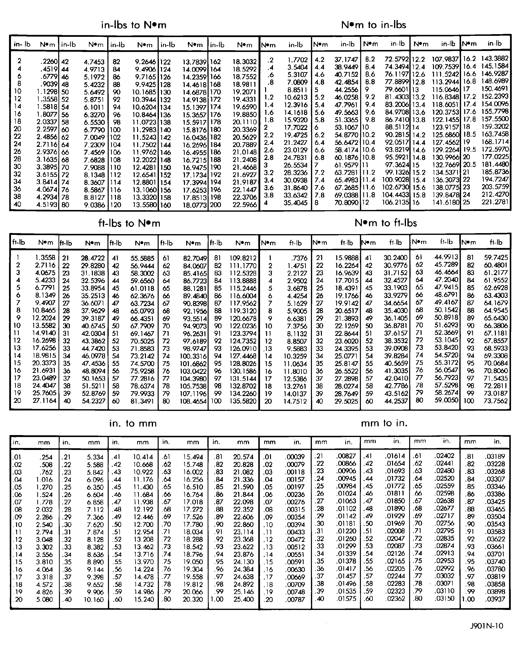 in-lbs x 0.11298 = Newton Meters (N.m) N.m x 8.851 = in-lbs