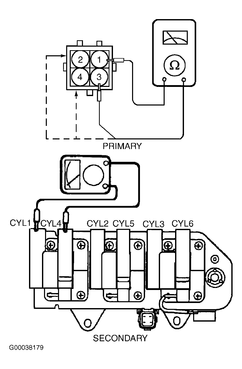 Measure resistance between connector terminals No. 1 and 2, 1 and 3 and 1 and 4. See Fig 1. For ignition coil resistance, see IGNITION COIL RESISTANCE table. If resistance is not as specified, replace coil pack.