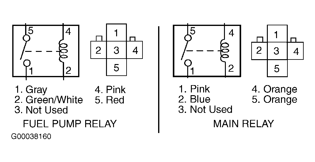 - Check continuity between relay terminals No. 1 and No. 5. Continuity should exist. If continuity does not exist, replace relay.