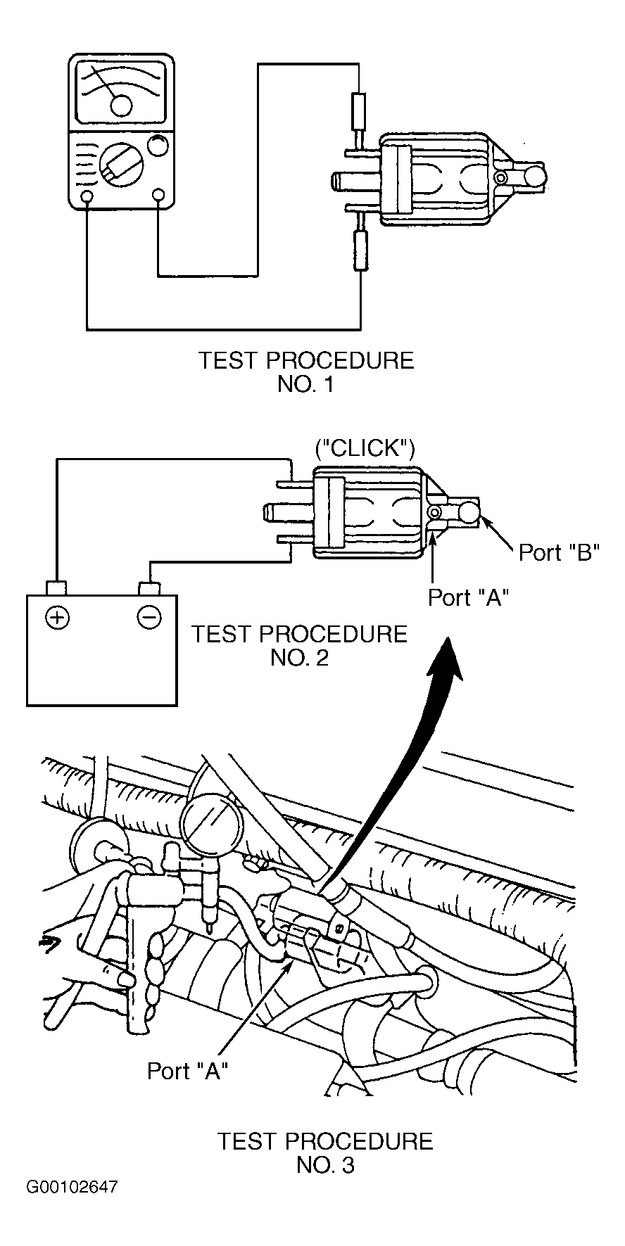 - Using a fused jumper wire, connect battery voltage to terminal No. 1, energize EGR solenoid by grounding terminal No. 2. Listen for operational sound (click). See Fig 1test procedure No. 2. If operational sound is heard, go to next step. If operational sound is not heard, replace EGR solenoid valve.