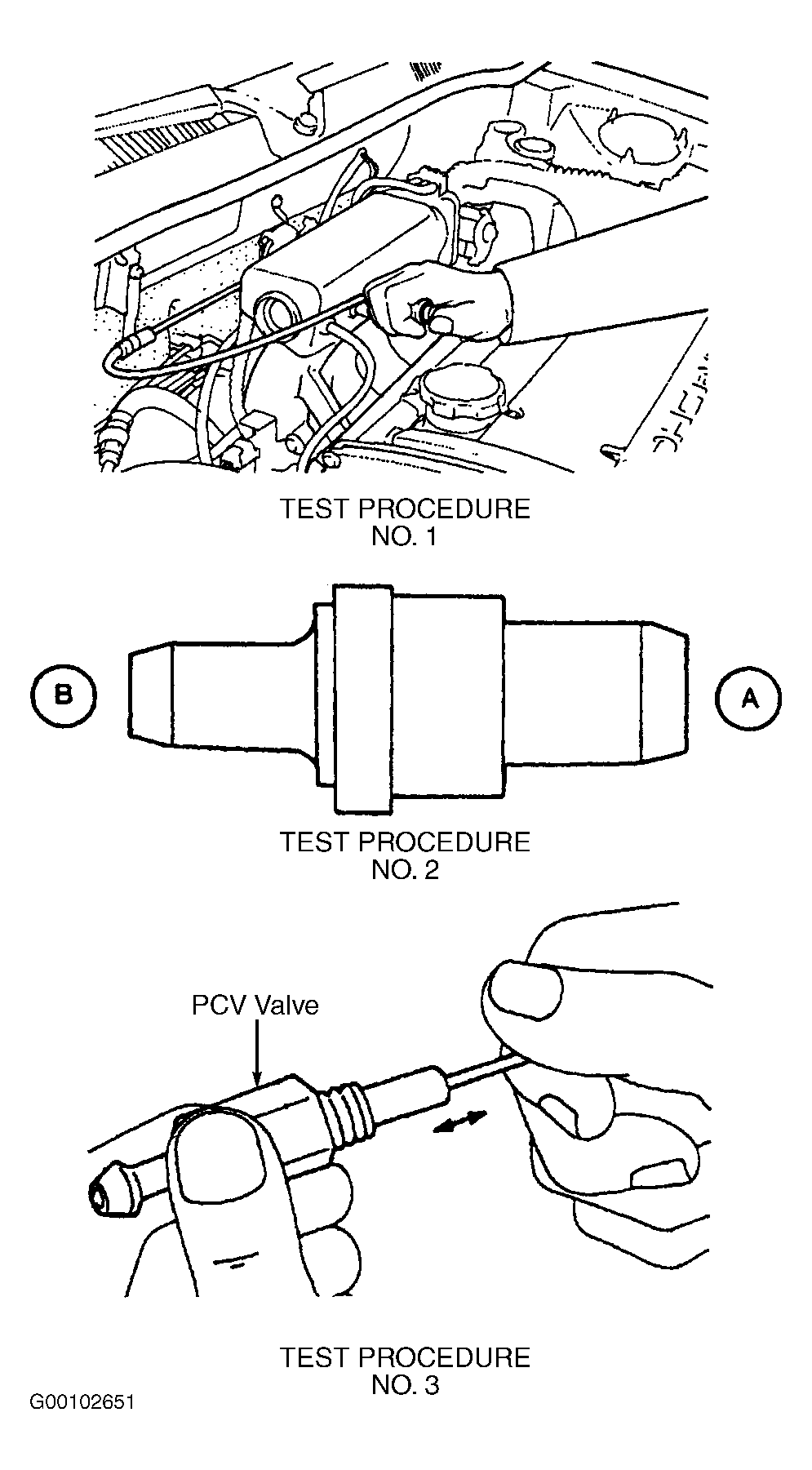 - Warm engine to normal operating temperature, and let it idle. Remove Positive Crankcase Ventilation (PCV) valve from cylinder head cover port. With PCV valve attached to vent hose, block PCV valve opening and check for vacuum. See Fig 1test procedure No. 1. If no vacuum is felt, check for blockage or collapsed vent hose, or restricted PCV valve. For vent hose problem, replace or repair as necessary. For PCV valve problem, go to next step.